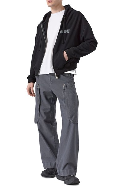 Толстовку из хлопкового трикотажа с добавлением полиэстера и эластана декорировали рельефной эмблемой с фирменным тотемным орлом. Модель на встречной молнии с брендированными пуллерами дополнили боковыми карманами с листочками.