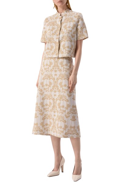 Жакет связали фактурным узором из микса вискозы и полиэстера. Фигурные лацканы и боковые карманы модели украсили объемным кантом с гранеными бусинами в тон.