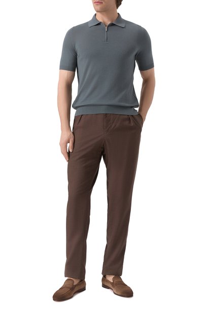 Поло из гладкого шерстяного трикотажа отделали вдоль боковых швов полосками матовой наппы. Модель кроя Regular fit застегивается молнией с брендированным пуллером.