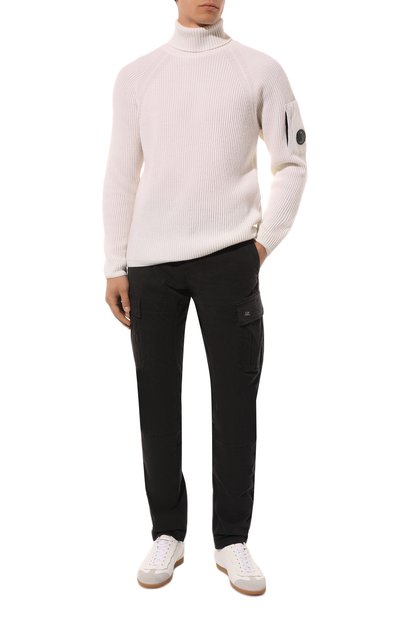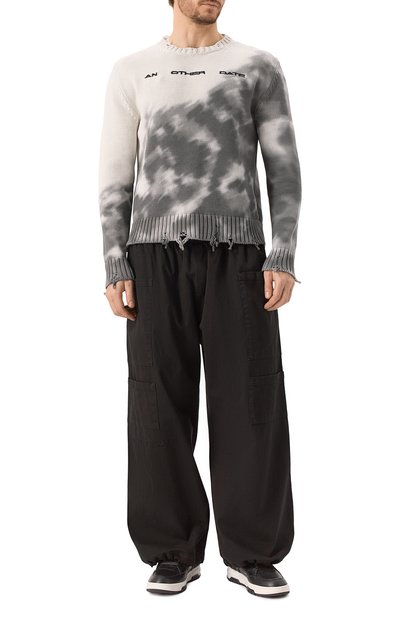 Свитер Klubfish с полосами на рифленой горловине связали из хлопковой пряжи. Модель со спущенной линией плеч, эластичными манжетами и поясом украсили жаккардовым мотивом, подчеркнутым вышивкой.