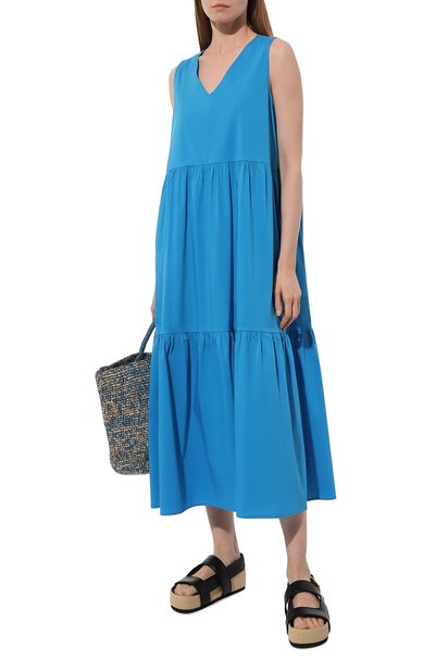 Макси-платье с трехъярусным подолом выполнили из немного просвечивающего полиэстера, намеренно не обработав края. Горловину дополнили завязками с фирменными эглетами, а само изделие застегивается молнией сбоку.