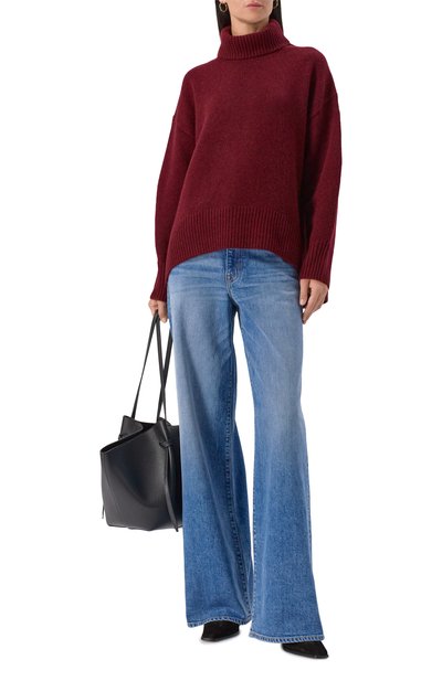 Для изготовления свитера со спущенной линией плеч и боковыми разрезами использовали шерсть. Высокий ворот, манжеты и пояс модели выполнили в рубчик.