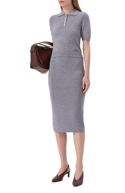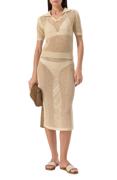 Сетчатое полупрозрачное поло без застежки связали из пряжи на основе хлопка и акрила. Наши стилисты предлагают носить модель поверх купальника, сочетая ее с парной юбкой.