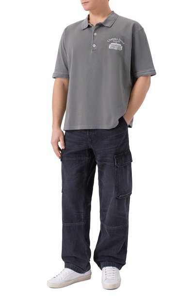 Льняное поло украсили брендированной надписью Summer lovers, вышитой разноцветными нитями спереди. Модель с узором в полоску застегивается перламутровыми пуговицами.