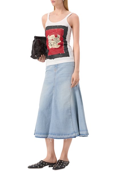 Топ с узкими бретелями и брендированной лентой на спинке выполнили из органического хлопка. Спереди – текстильная вставка с портретом Данте Алигьери авторства Сандро Боттичелли, напоминающая закрашенную масляной краской книжную страницу.