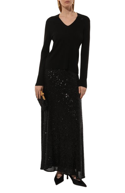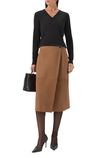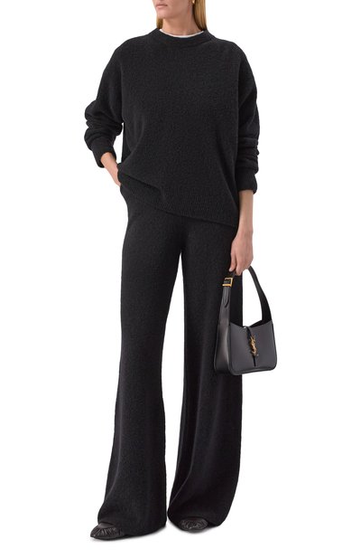 Для изготовления пуловера с эластичными манжетами и поясом выбрали тонкий трикотаж из кашемира и шелка. Модель с круглой горловиной идеально дополнит базовый гардероб.