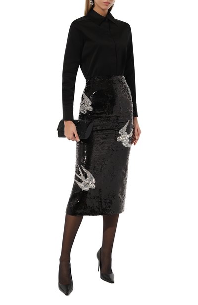 Миди-юбка, расшитая пайетками на фабрике итальянской марки Graziano Ricami S.P.A., составит гармоничный образ total black с парным топом. Сзади модель из полиамида стрейч дополнили шлицей. Изделие с высокой посадкой застегивается потайной молнией.