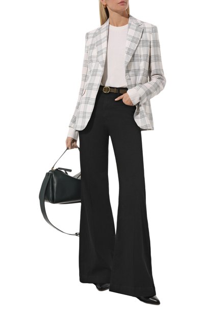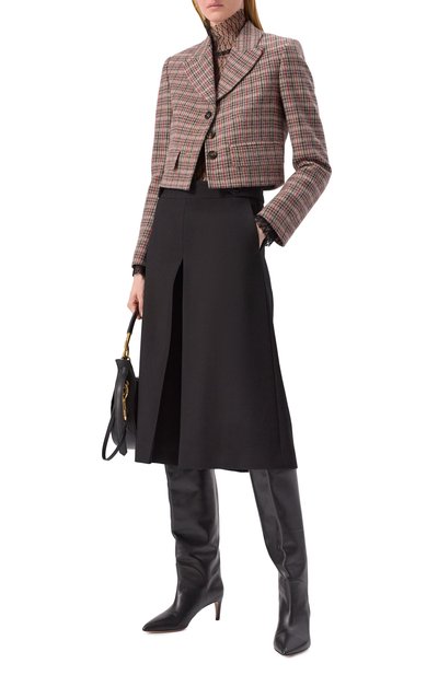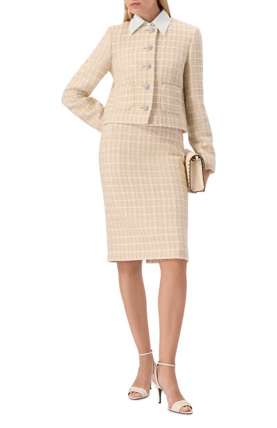Жакет с круглой горловиной и боковыми прорезными карманами застегивается кристальными пуговицами. Модель из полушерстяного твида с добавлением шелка и ламинированных нитей органично впишется в образ с парной юбкой.