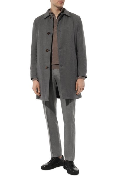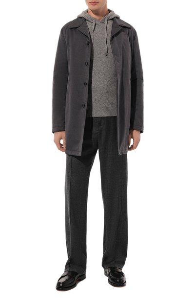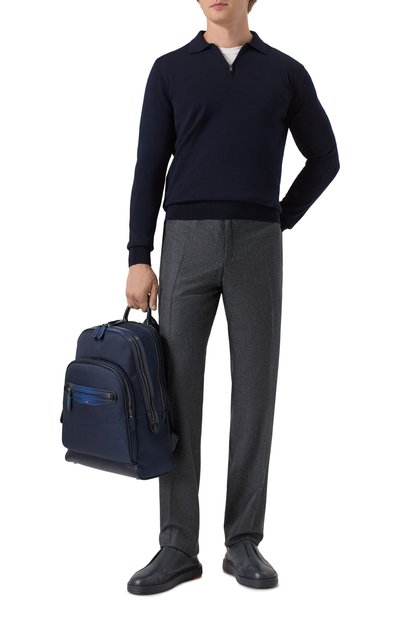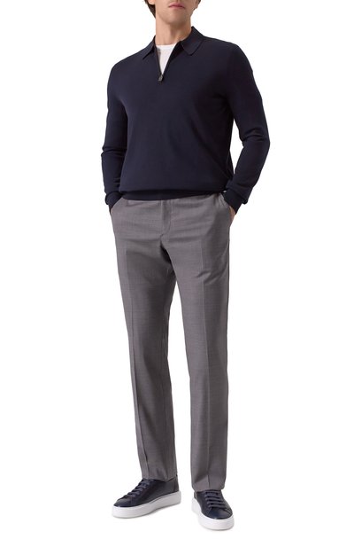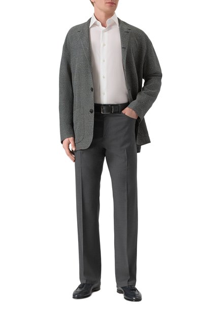 Для пошива прямых брюк со стрелками и пятью карманами использовали ткань на основе льна и шерсти. Пояс модели сзади украсили брендированным патчем в тон.