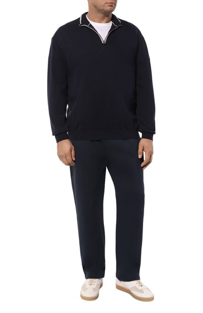 Брюки с регулируемым поясом-кулиской в рубчик дополнили двумя врезными карманами по бокам и еще одним накладным сзади. Модель сшили из хлопкового трикотажа.