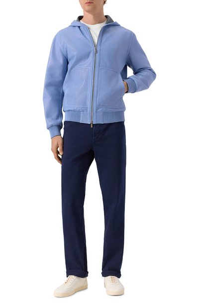 Джинсы с фирменным жакроном на поясе сзади украсили вышитой эмблемой Solomeo на самом маленьком из пяти карманов. Брюки силуэта Traditional Fit, изготовленные из эластичного денима, окрасили в готовом виде.