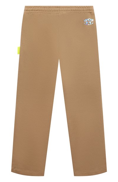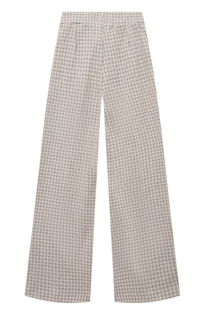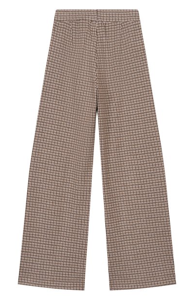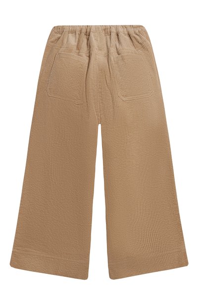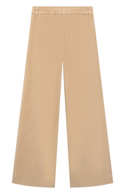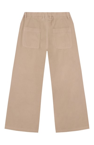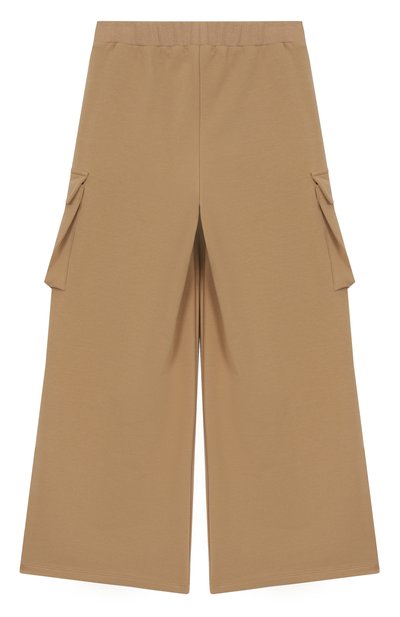 Брюки с широким эластичным поясом изготовили из ткани, сочетающей хлопок и лен. Широкую модель украсили золотистой накладкой в виде логотипа.