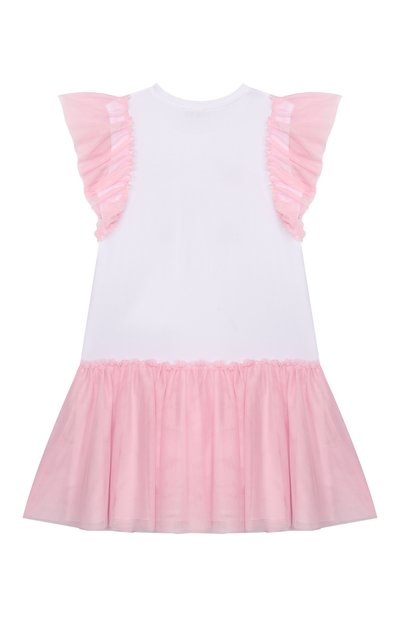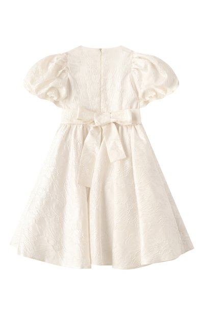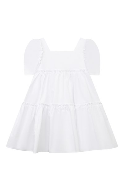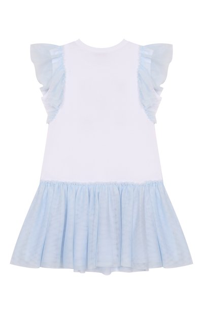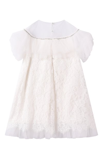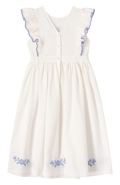 Короткое платье-рубашку на пуговицах выполнили из хлопкового поплина оттенка White ice. Модель с драпированными рукавами и узким воротником-стойкой украсили ажурными вставками и шитьем. На спинке изделия — эмблема Oval T.