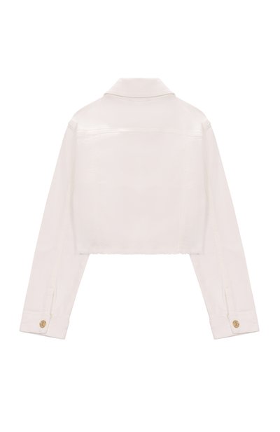 Джинсовую куртку со специально необработанным низом дополнили двумя нагрудными карманами с клапанами. Модель с брендированными металлическими пуговицами выполнили из стрейчевого денима.