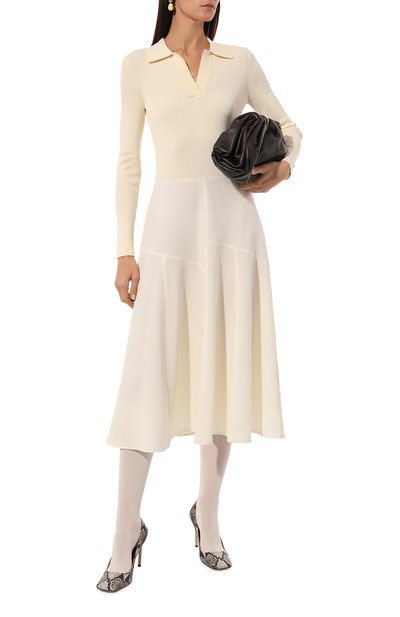 Приталенное миди-платье с имитацией запаха и декоративным поясом спереди выполнили из плиссированного полиэстерового жоржета. Сзади модель украсили фирменной эмблемой Oval T. В комплекте — нижнее платье-комбинация.