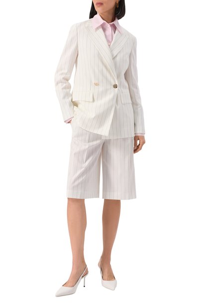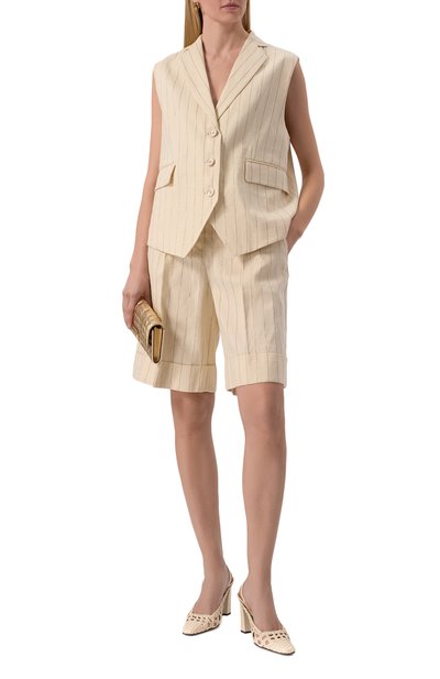 Двубортный жилет с заостренными лацканами и подплечниками, формирующими акцентированную линию плеч, дополнили боковыми карманами с клапанами. Модель из костюмной вискозной ткани в меловую полоску украсили брендированной пластиной сзади.