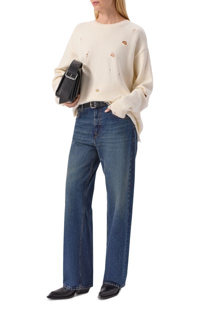 Пуловер из хлопкового трикотажа дополнили поплиновой вставкой в виде рубашки с кружевным воротником. Модель с манжетами и поясом в рубчик украсили эмблемой бренда сзади.