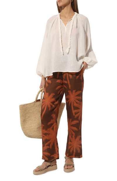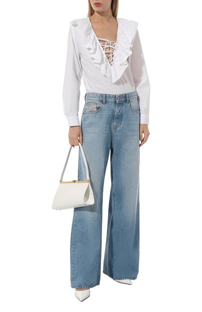 Блузу из полупрозрачного тюля в горох украсили плиссированными оборками. Модель с эмблемой Oval T на спинке, как и манжеты длинных рукавов, застегивается пуговицами сзади.
