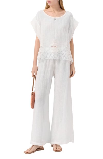 Топ с поясом, манжетами и горловиной в рубчик выполнили из вискозной пряжи с добавлением полиэстера. Спереди модель оттенка White Snow украсили вывязанной эмблемой Oval T.