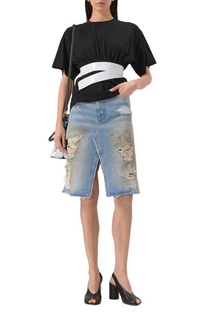 Футболку с круглой горловиной в рубчик выполнили из хлопкового джерси. Модель с фирменной белой строчкой на спинке дополнили глянцевой аппликацией-лентой, имитирующей скотч.
