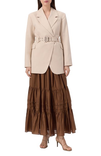 Жакет Emozioni с нагрудным и двумя боковыми карманами выполнили из фризотина на основе крученых вискозных нитей. Свободную модель с подплечниками дополнили двумя узкими регулируемыми ремнями с брендированными пряжками.