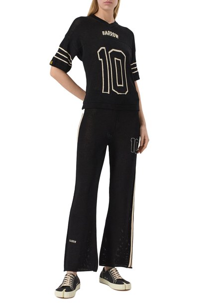 Брюки Spirito выполнили из однотонного жоржета и вискозного твила с контрастным принтом Bandana. Модель с карманами по бокам дополнили эластичной вставкой на поясе и кулисками на брючинах снизу.