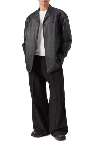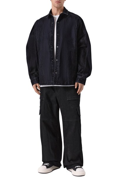 Свободную рубашку с кулиской снизу и двумя боковыми карманами выполнили из плотного хлопка. Модель с супатной застежкой украсили логотипом, вышив его на груди нитью в тон.