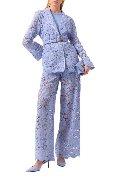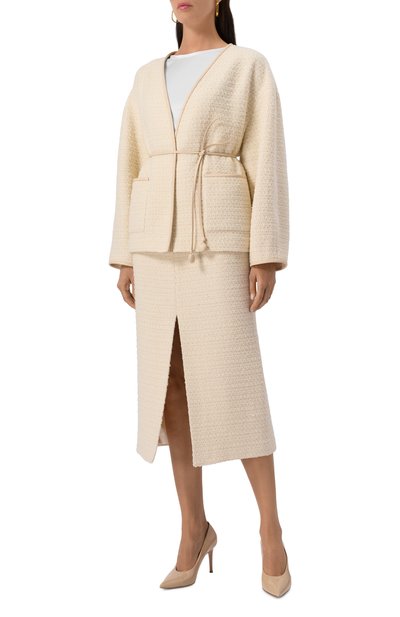 Однобортный жакет с прямоугольными лацканами сшили из шелкового атласа с графичным фирменным мотивом. Приталенная модель с боковыми накладными карманами застегивается двумя перламутровыми пуговицами.