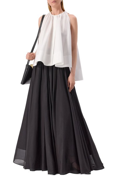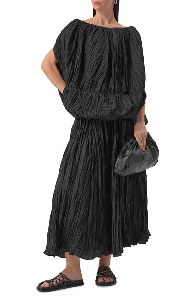 Для пошива объемного топа использовали плиссированный микс полиэстера и хлопка. Модель с вырезом «лодочка» и кулиской внизу составит гармоничный аутфит с парной юбкой и сандалиями.