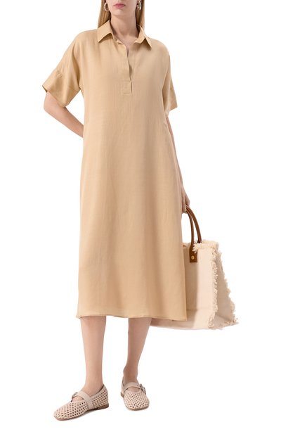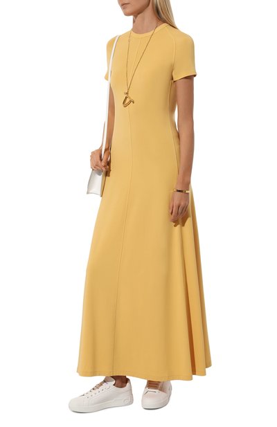 Платье с круглой горловиной в рубчик изготовили из тонкого кашемирового трикотажа. Напоминающая удлиненную футболку модель наши стилисты предлагают сочетать с контрастными туфлями.