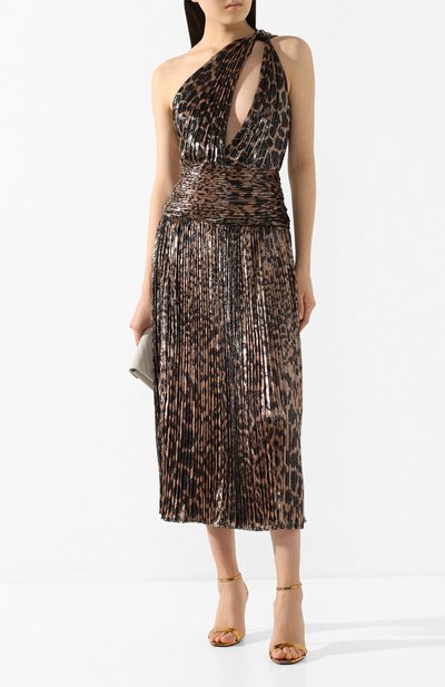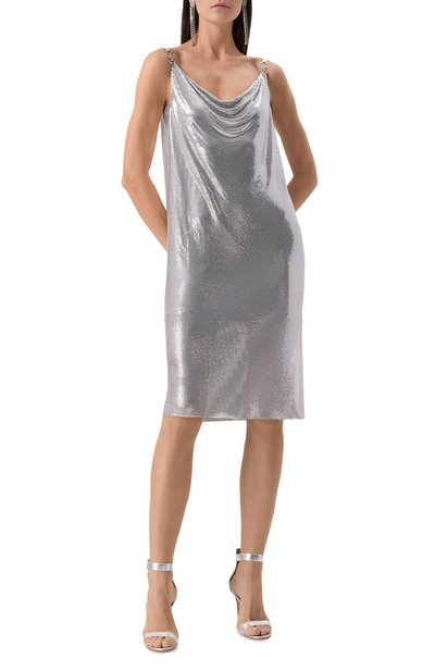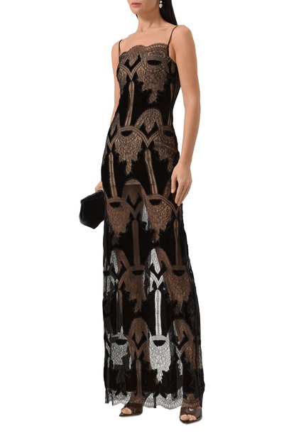 Вечернее платье из полиамида стрейч расшили цветными пайетками на итальянской мануфактуре Graziano Ricami, сформировав деликатный градиент. Открытую спину приталенной модели подчеркнули узкими перекрещивающимися бретелями.