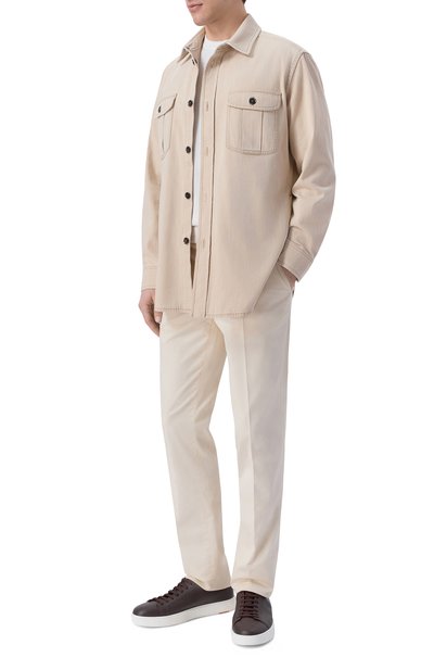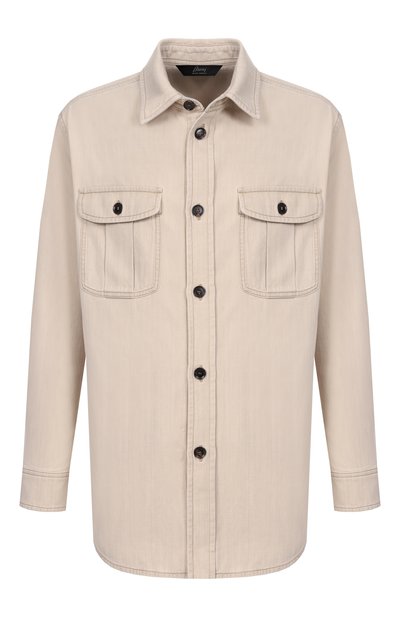 Слегка выбеленную джинсовую рубашку с прямоугольными манжетами, бантовой складкой и фигурным низом дополнили удлиненными нагрудными карманами с боковыми входами. Оверсайз-модель из необработанного японского денима украсили кожаным брендированным патчем сзади.
