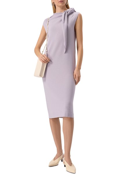 Короткое платье-рубашку с цельнокроеными рукавами, глубокими проймами и фигурным низом сшили из хлопкового поплина. Спереди модель украсили контрастной вышитой эмблемой марки.