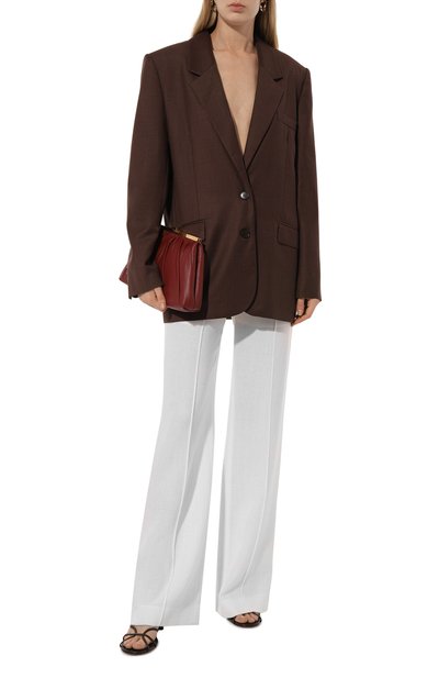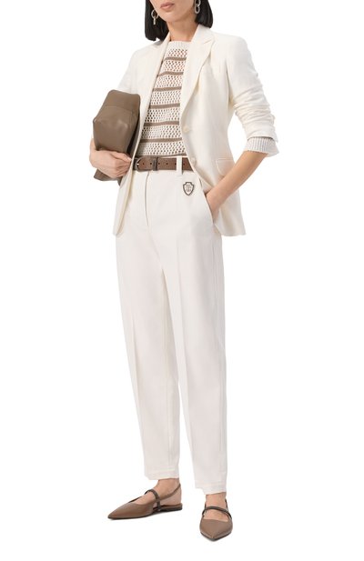 Широкие прямые брюки со съемным ремнем выполнили из вискозы с добавлением льна. Один из четырех карманов модели украсили символикой в тон.