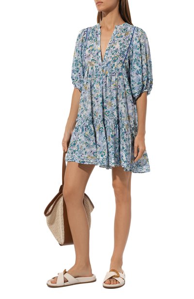 Платье Aria в стиле baby doll выполнили из хлопка с принтом Blue Ylang Ylang. Лиф модели с V-образным вырезом и рукавами-фонариками украсили вышивкой металлизированными нитями, а подол подчеркнули широкой оборкой.
