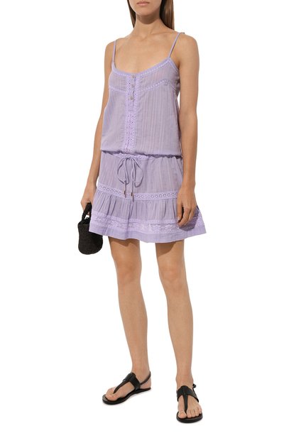 Мини-платье Cara с глубоким декольте и оборкой на подоле выполнили из хлопкового кружева сангалло, подчеркнув его цветочный мотив на лифе пайетками в тон. Модель с фестончатым кантом по краям и плетеными вставками из тесьмы дополнили длинными завязывающимися лентами на плечах. Сбоку предусмотрели молнию.