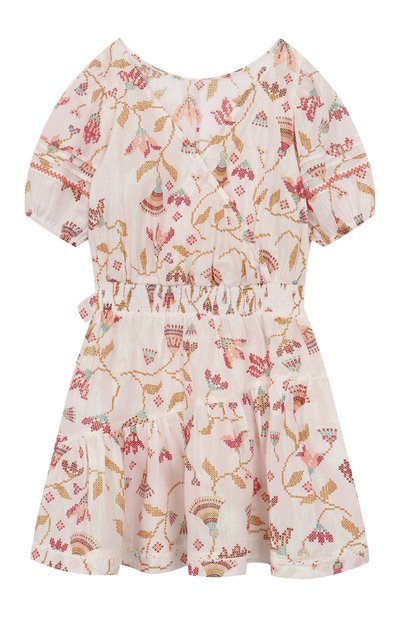 Платье Aria с трафаретным принтом Pink Ylang Ylang выполнили из хлопка с добавлением нитей ламе. Модель с плиссированной оборкой на подоле и рукавами-фонариками 3/4 дополнили тремя перламутровыми пуговицами в форме сердца.