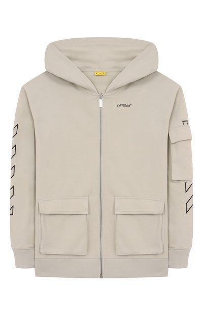 Толстовку из хлопкового трикотажа украсили фирменными диагональными полосами и небольшим логотипом марки. Модель с эластичными манжетами и поясом дополнили накладными боковыми карманами и еще одним на левом рукаве.