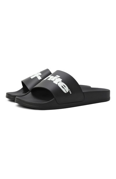 Шлепанцы с формованной стелькой украшены контрастным принтом-логотипом, разделенным по полупарам. Модель из матового полимера установили на широкую резиновую подошву.
