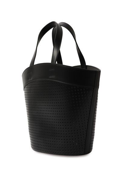 Мини-сумку из глянцевого полимера украсили контрастным фирменным логотипом и изображением ярких бабочек. Внутри аксессуара с плечевым ремнем разместили асимметричный брендированный патч.