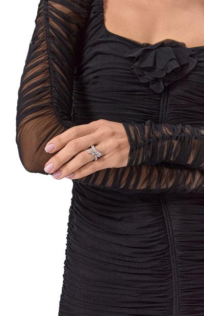 Незамкнутое кольцо Constella выполнили из полированного ювелирного сплава с родиевым покрытием. Декор в виде созвездия дополнили прозрачными кристаллами и хрустальными жемчужинами.