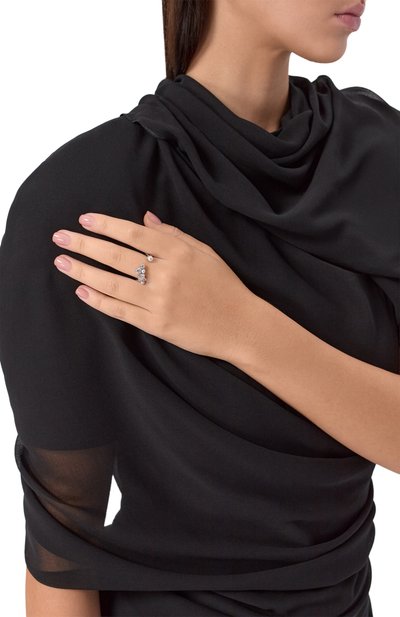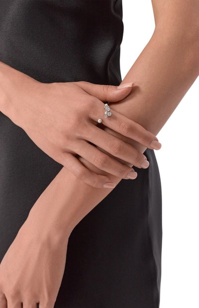 Незамкнутое кольцо Constella выполнили из полированного ювелирного сплава с родиевым покрытием. Декор в виде созвездия дополнили прозрачными кристаллами и хрустальными жемчужинами.