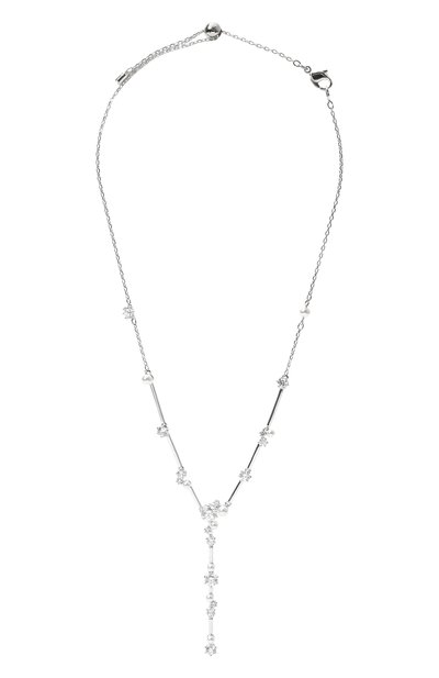 Y-образное колье Constella выполнено из латуни с гальваническим покрытием родием. Аксессуар со скользящей шариковой застежкой украшен гранеными кристаллами циркония и жемчужными бусинами.