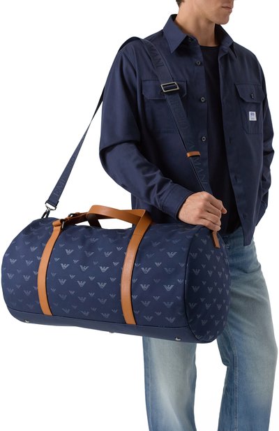 Для изготовления сумки с регулируемым съемным ремнем использовали мелкозернистую кожу. Модель с брендированной нашивкой спереди и перемычкой для крепления на ручке чемодана сзади дополнили внешним и двумя внутренними карманами. В комплекте — брелок в виде фирменного акульего плавника.