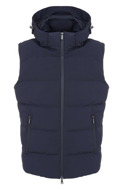Утепленный гусиным и утиным пухом жилет со съемным регулируемым капюшоном выполнили из эластичного полиэстера. Стеганую модель на прорезиненной молнии дополнили двумя внешними карманами и еще одним внутри с функцией E.M.W. protection, обеспечивающей защиту от электромагнитных волн.