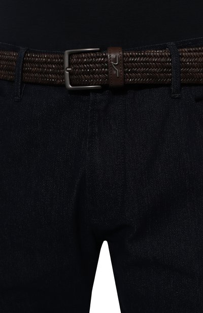 Ремень стандартной ширины сплели из эластичных текстильных шнуров, а для отделки использовали гладкую кожу. Аксессуар с матовой квадратной пряжкой декорировали на наконечнике тисненым изображением фирменной акулы.