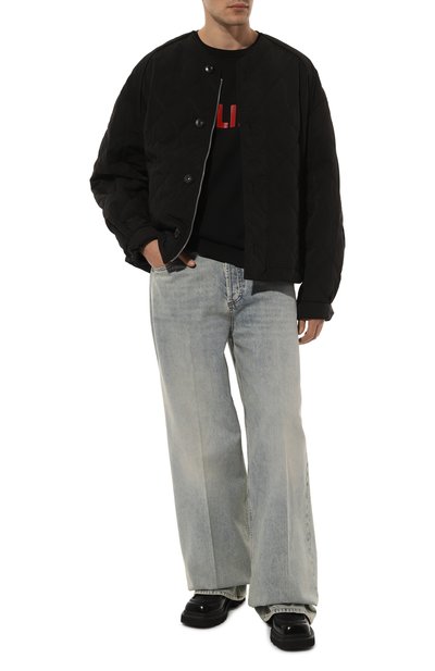 Футболку с неглубокой круглой горловиной выполнили из хлопка. Принадлежность модели бренду обозначили фактурным контрастным логотипом на груди.