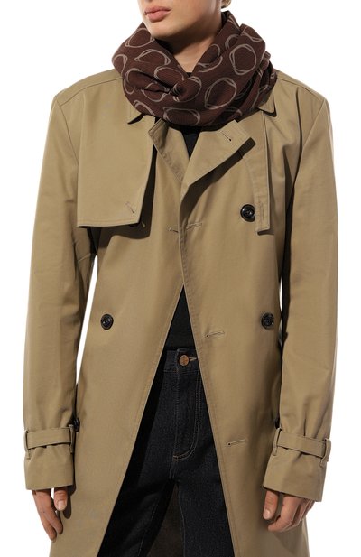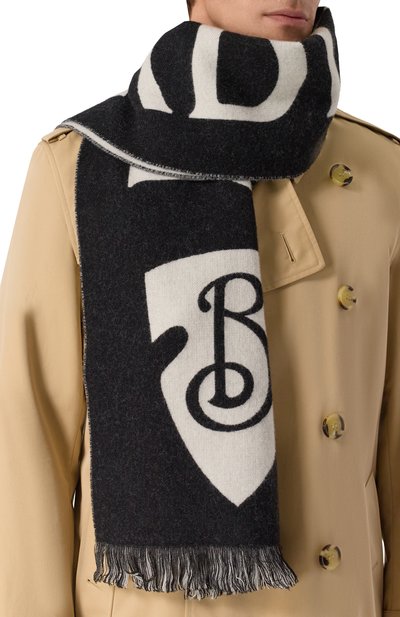 Шарф с крупным жаккардовым логотипом украсили бахромой по краям. Для изготовления широкого аксессуара использовали чистую шерсть.