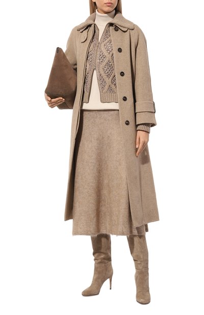 Кардиган с круглым вырезом связали ажурным узором из хлопковой пряжи с добавлением полиамида. Вдоль планки с вязаными пуговицами модель с отделкой в рубчик украсили крупными цветами и листьями ручной работы.
