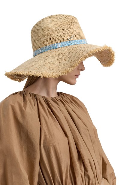 Широкополую шляпу выполнили в технике color block из конопляной соломки и полиэстеровой пряжи. Ажурную модель украсили рельефным логотипом марки на тулье сбоку.